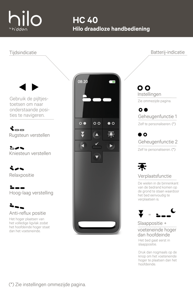 De intuïtieve, draadloze handbediening biedt twee instelbare posities die je eenvoudig aanpast, zodat jouw favoriete instellingen altijd binnen handbereik zijn.